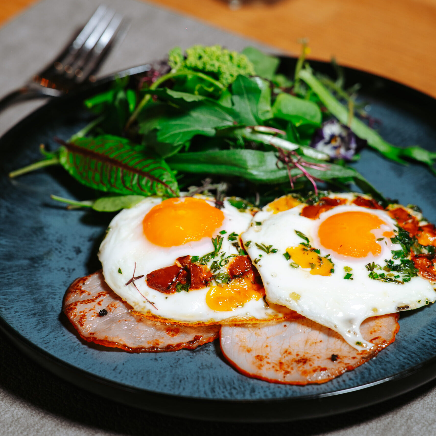 Smoked pork loin, fried eggs, salad